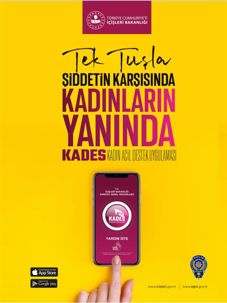ürkiye Cumhuriyeti İçişleri Bakanlığı koordinesinde Emniyet Genel Müdürlüğü tarafından geliştirilen KADES (Kadın Acil Destek Uygulaması), şiddet gören veya şiddet görme riski altında olan kadınların ve çocukların acil durumlarda yardım alabilmesini sağlayan ücretsiz ve güvenli bir mobil uygulamadır.Uygulamayı, KADES iOS (App Store) ve KADES Android (Google Play) platformlarından indirebilirsiniz.