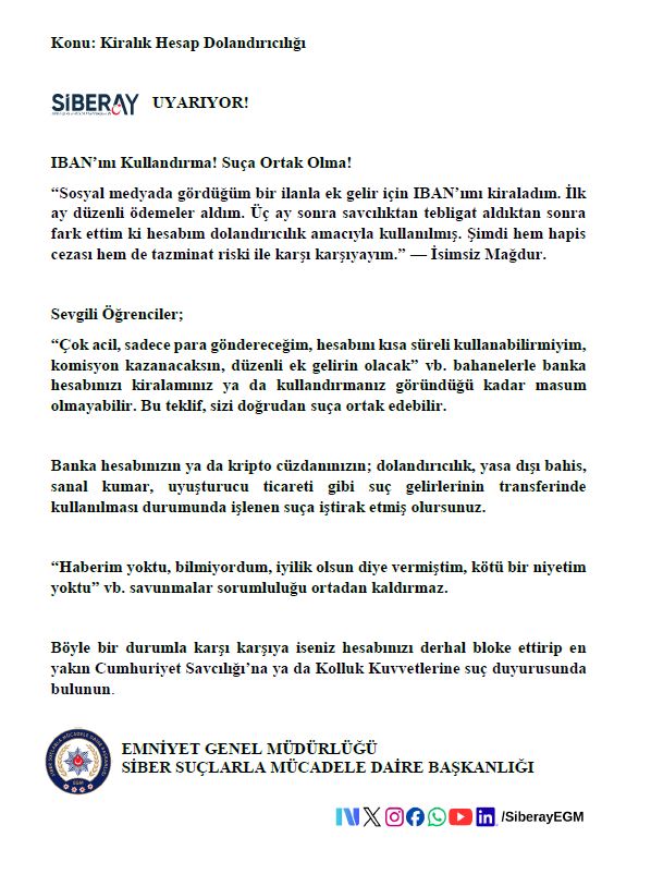 Son dönemde üniversite öğrencilerine ait banka hesapları ve dijital cüzdanların üçüncü kişiler tarafından kullanılması suretiyle dolandırıcılık, yasa dışı bahis ve uyuşturucu kaçakçılığı gelirlerinin aklanması gibi olaylarda ciddi artış yaşanmaktadır. Kendi adınıza kayıtlı banka hesaplarınızın veya dijital cüzdanlarınızın; “komisyon kazanma”, “borç ödeme yardımı”, “sadece bir kez kullanma”, “zararsız para transferi” veya benzeri gerekçelerle başkaları tarafından kullanılmasına bilerek ve isteyerek izin verilmesi, Türk Ceza Kanunu ve ilgili mevzuat kapsamında cezai ve hukuki sorumluluk doğurabilir. Hesaplarınız üzerinden gerçekleştirilen işlemlerden, işlemi fiilen yapan kişi kim olursa olsun, hesap sahibi olarak siz sorumlu tutulabilirsiniz.